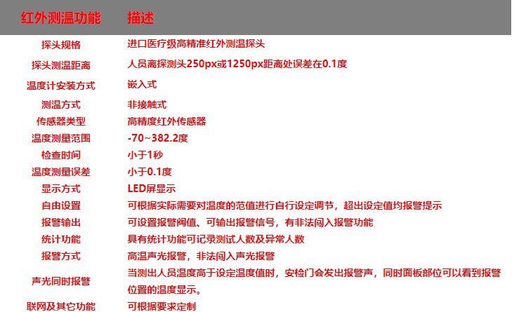 遠距離高精度人體測溫安檢門,集帶人體溫度檢測和金屬探測為一體的安全檢測門,門頭裝有高精度的體溫檢測探頭,探測角度可以上下移動, 能夠測量人體額頭的表面溫度,然后根據(jù)人體額頭的溫度與體溫的關(guān)系得到人體的實際體溫。檢測儀的光學組件將額頭發(fā)射和反射的能量匯集到傳感器上,通過電子組件將此信息轉(zhuǎn)化成溫度讀數(shù)并顯示在顯示面板上,當溫度讀數(shù)超過高溫報警值時,儀器會發(fā)出報警聲.報警溫度可隨意設(shè)置.具有防水、防火、防腐等特點。適用于管制刀具和槍支等危險品的安全檢查,廣泛應(yīng)用于適用于機場,車站,出入境檢查站,等人員密集場所。是防止疫情擴散的有效手段。