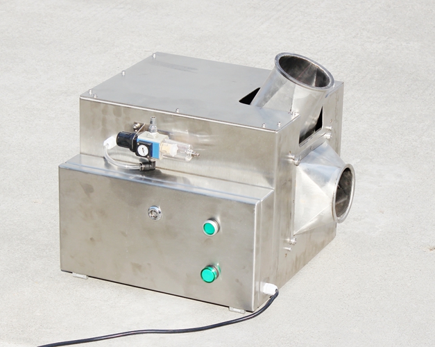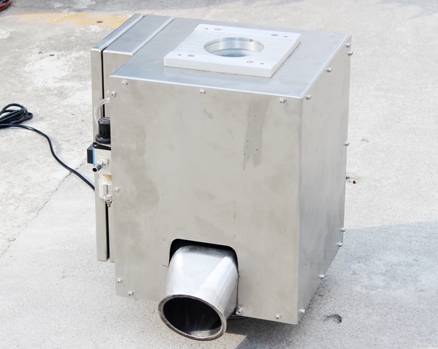 原料從料斗或送料器自由下落進(jìn)入金屬分離器,如果沒(méi)有金屬雜質(zhì),原料會(huì)直接通過(guò)金屬分離器流向下端的出料口。如果檢測(cè)器檢測(cè)到原料中含有金屬,那么控制器立刻啟動(dòng)分離板將金屬物和部分原料一起導(dǎo)向側(cè)面的排料口,然后分流板迅速恢復(fù)至正常的位置,分流板速度可調(diào),金屬分離器的檢測(cè)精度也可根據(jù)生產(chǎn)需要調(diào)節(jié),最小可檢測(cè)并分離出Φ 0.2mm的金屬顆粒。